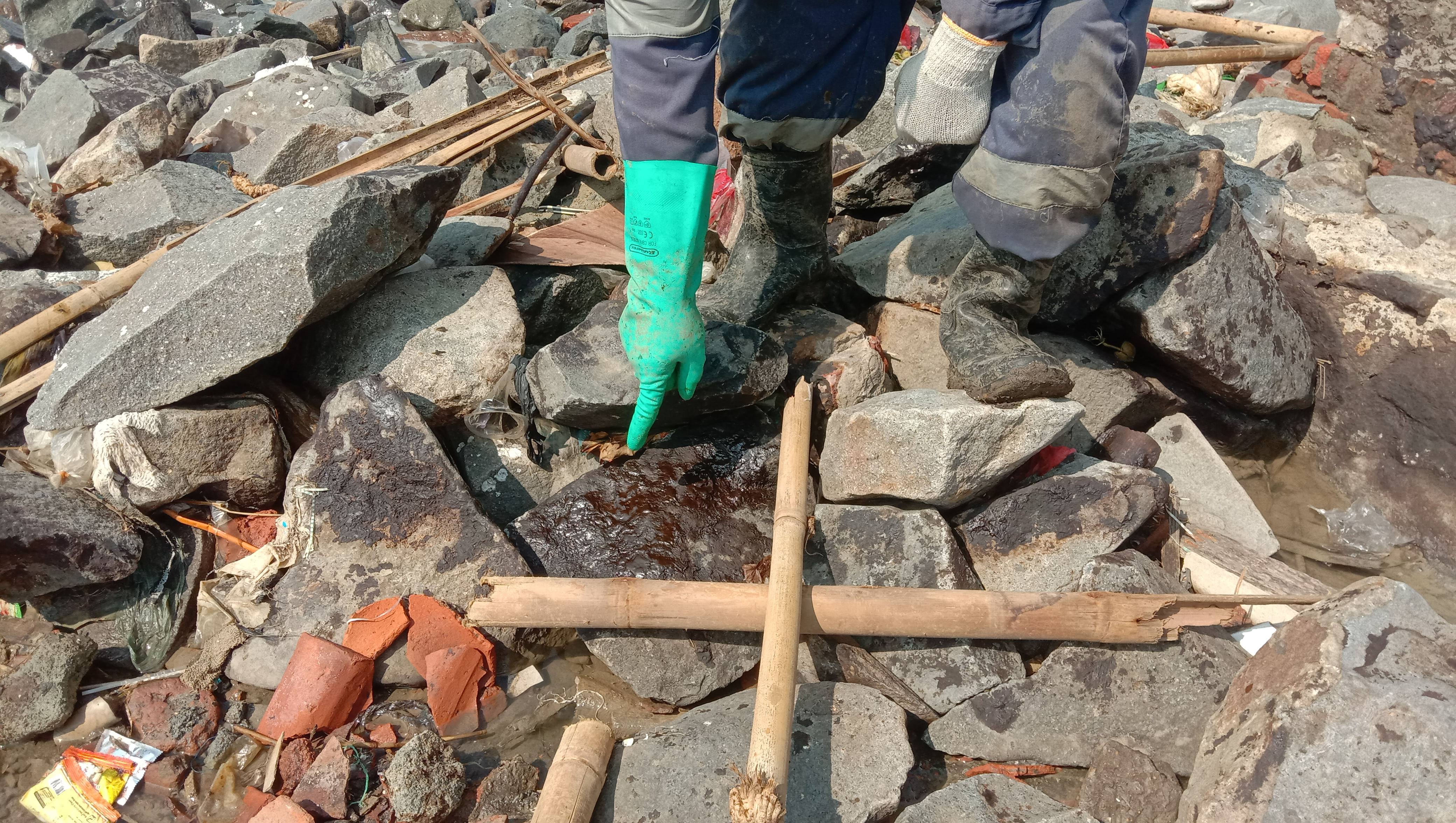“Sisa limbah minyak mentah ini tertumpuk batu dan pasir. Pas air laut meluap dia timbul,” jelasnya.