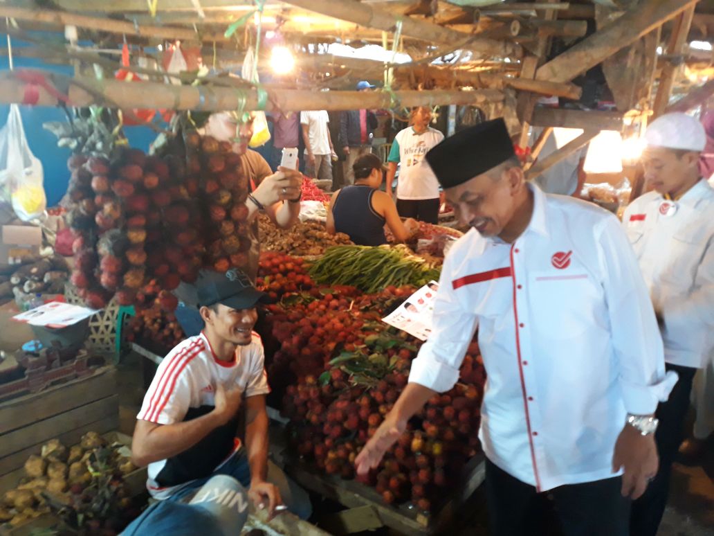 Calon Wakil Gubernur Jawa Barat nomor urut 3, Ahmad Syaikhu dalam kampanye perdananya di Karawang mengunjungi pedagang beras pasar Johar dan pedagang sayuran di Pasar Rengasdengklok Karawang, Jumat (23/2). Syaikhu menyapa dan berdialog dengan para pedagang di pasar tersebut.