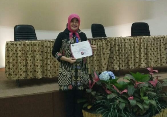 Ekowati –Kepala Sekolah SMAN 2 KOTA BEKASI bangga menunjukkan penghargaan prestasi Ranking 5 Kepsek Tingkat Propinsi Jawa Barat.