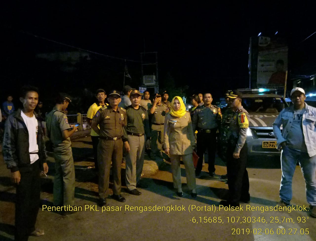 Kepolisian Sektor (Polsek) Rengasdengklok, bersama Koramil 0404 Rengasdengklok dampingi Satuan Polisi Pamong Praja (Sat Pol PP) Kecamatan Rengasdengklok saat lakukan pemantauan terhadap para Pedagang Kaki Lima (PKL) setelah membuat kesepakatan tentang larangan berdagang diatas jalan atau jembatan perbatasan Kecamatan Rengasdengklok dan Kecamatan Kutawaluya, yang sering membuat kemacetan sehingga menimbulkan keluhan dari masyarakat pengguna jalan, Rabu (6/2/2019) dini hari.