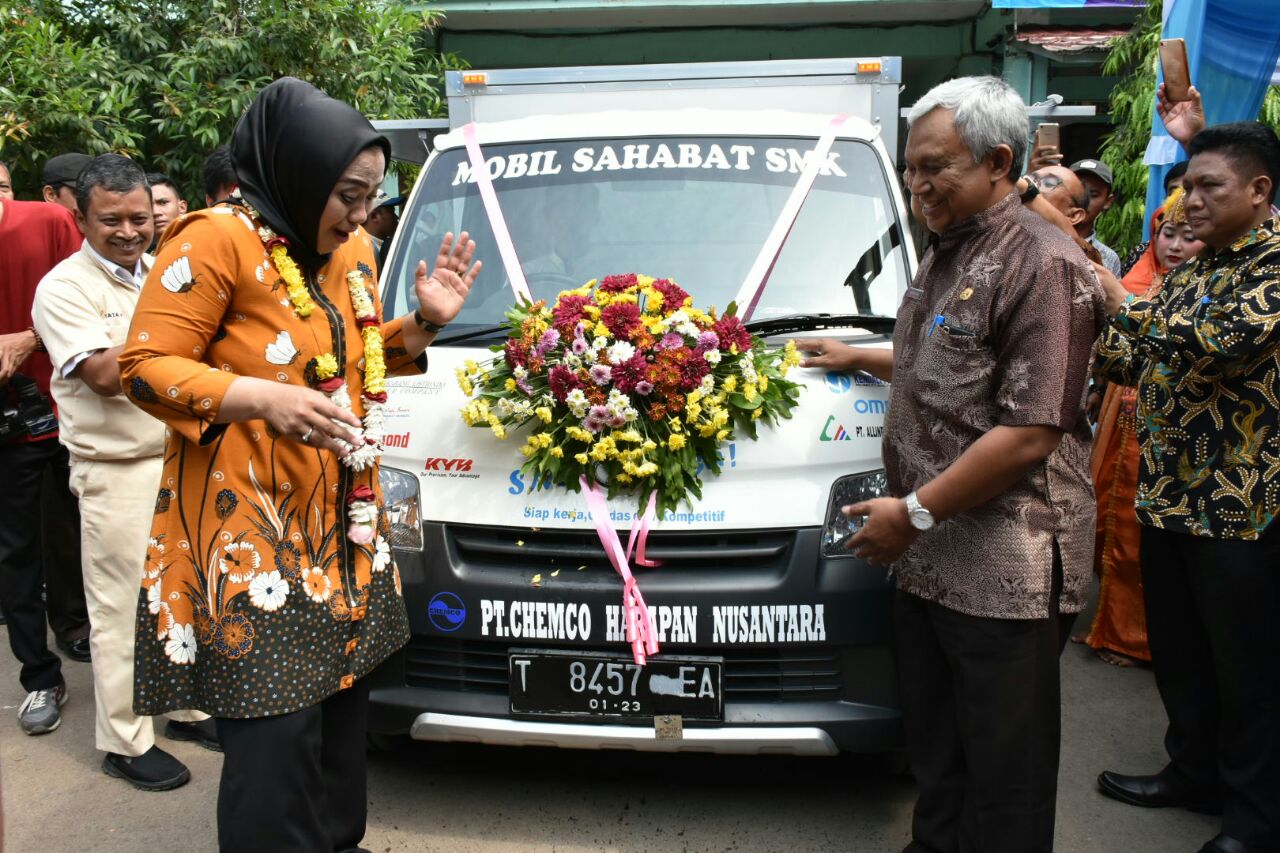 Bupati Karawang, Cellica Nurrachadiana hadiri Launching Cerdik SMK Link and Match atas kerjasama BKK SMK Bina Karya 1- PT.Chemco bertempat di Kampus SMK Bina Karya 1 Karawang, Kamis (3/5).