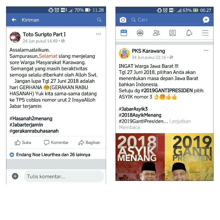 Hal serupa dilakukan akun facebook dengan nama PKS Karawang yang juga memposting status yang terlihat berkampanye pada tanggal 24 Juni 2018, namun akun dengan nama PKS Karawang tersebut telah menghapus kembali postingan tersebut.(dar)
