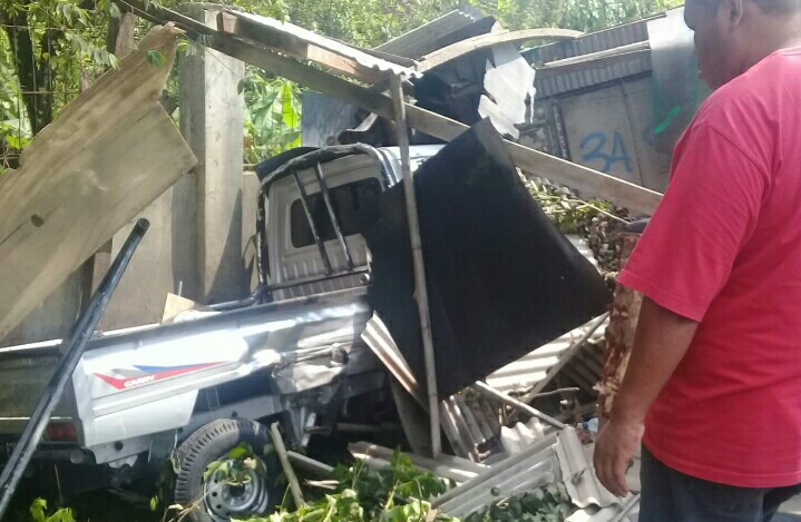 Mobil pick up seruduk warung pinggir jalan di Kelurahan Tanjungmekar, Kecamatan Karawang Barat, Jumat (3/5/2019) petang. Belum diketahui penyebab utama kecelakaan tersebut.