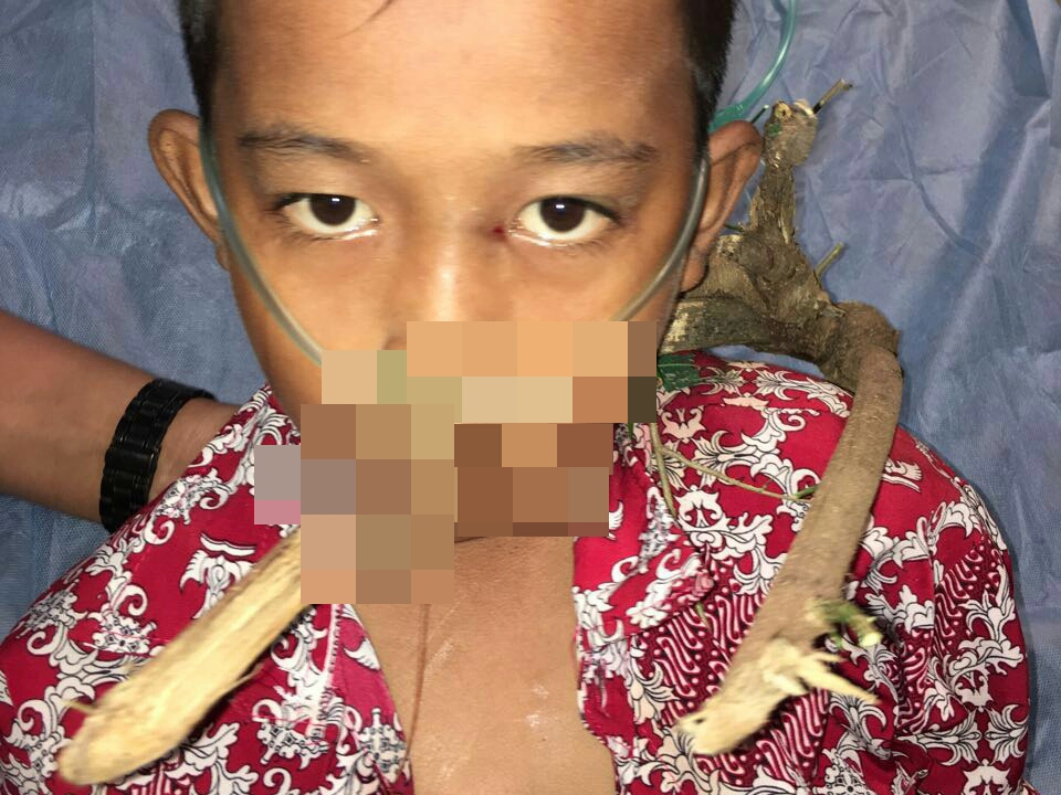 Muhamad Kafi Rizki (10) siswa Sekolah Dasar Negri (SDN) Dewisari 2, yang lehernya tertusuk dahan pohon hingga tembus ke bagian mulut, setelah terjatuh dari sebuah warung ke area sipo dengan ketinggian sekitar 3 meter di Dusun Pacing Selatan Rt 04/02 Desa Dewisari.