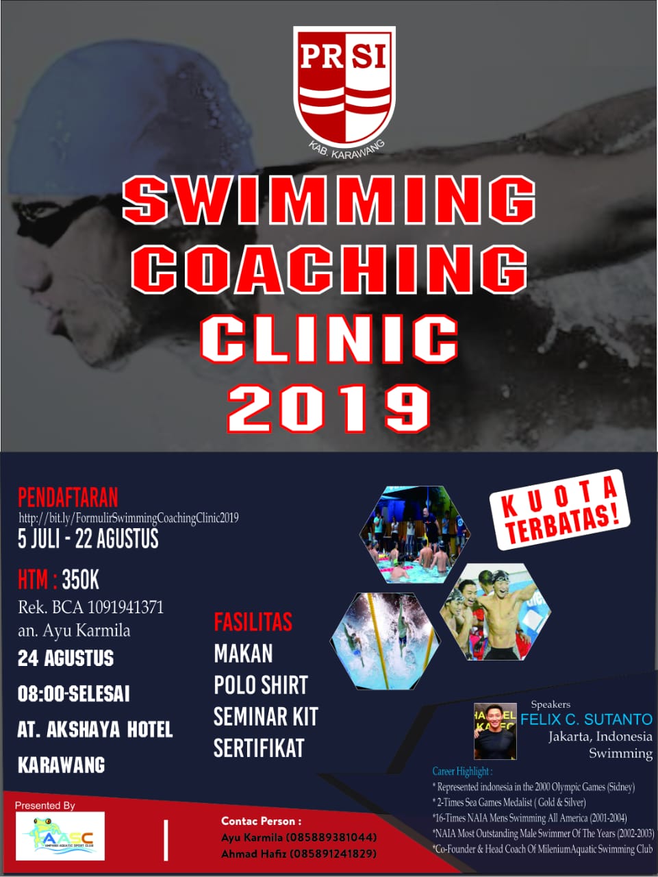 KARAWANG, Spirit – Pengurus Cabang (Pengcab) Persatuan Renang Seluruh Indonesia (PRSI) Kabupaten Karawang akan menggelar Swimming Coaching Clinic di Akshaya Hotel, Telukjambe Timur, Karawang,
