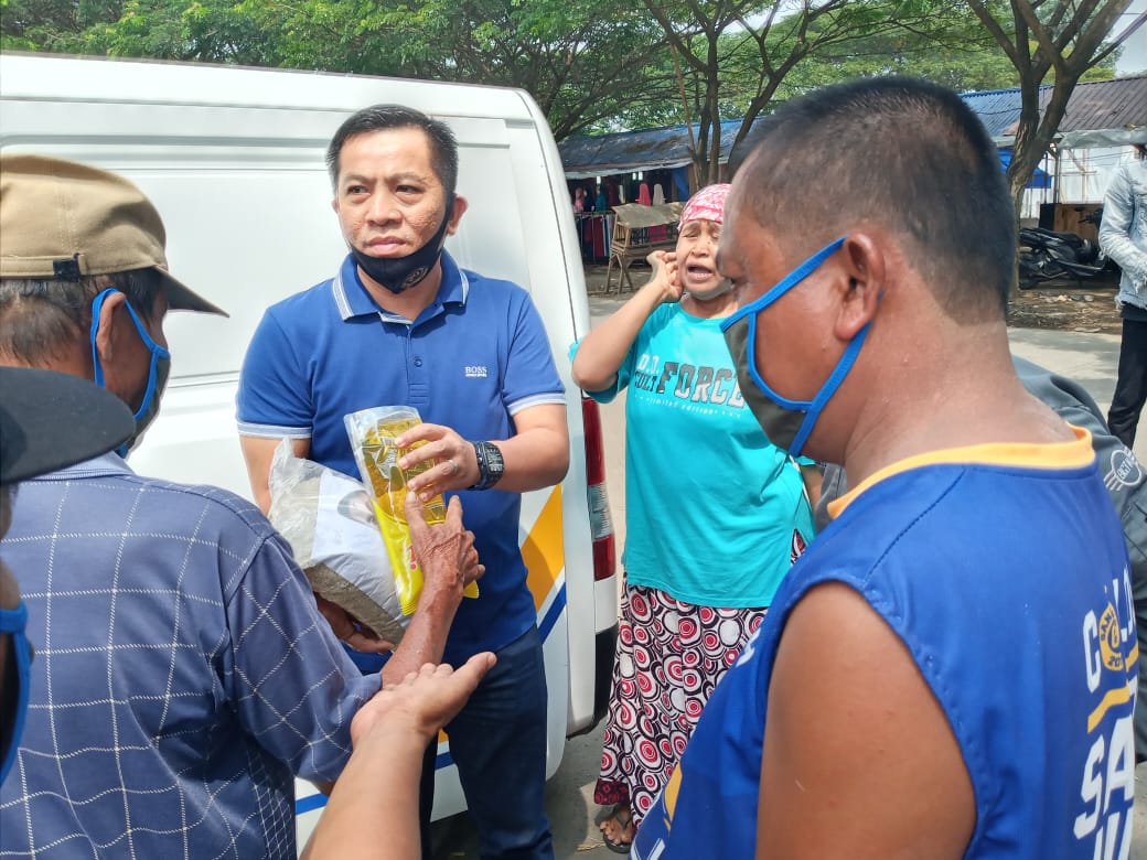 KARAWANG, Spirit – Bakal calon bupati Karawang, H. Aep Syaepuloh membagikan beras dan minyak goreng kepada ratusan tukang becak dan ojek di sekitar tugu