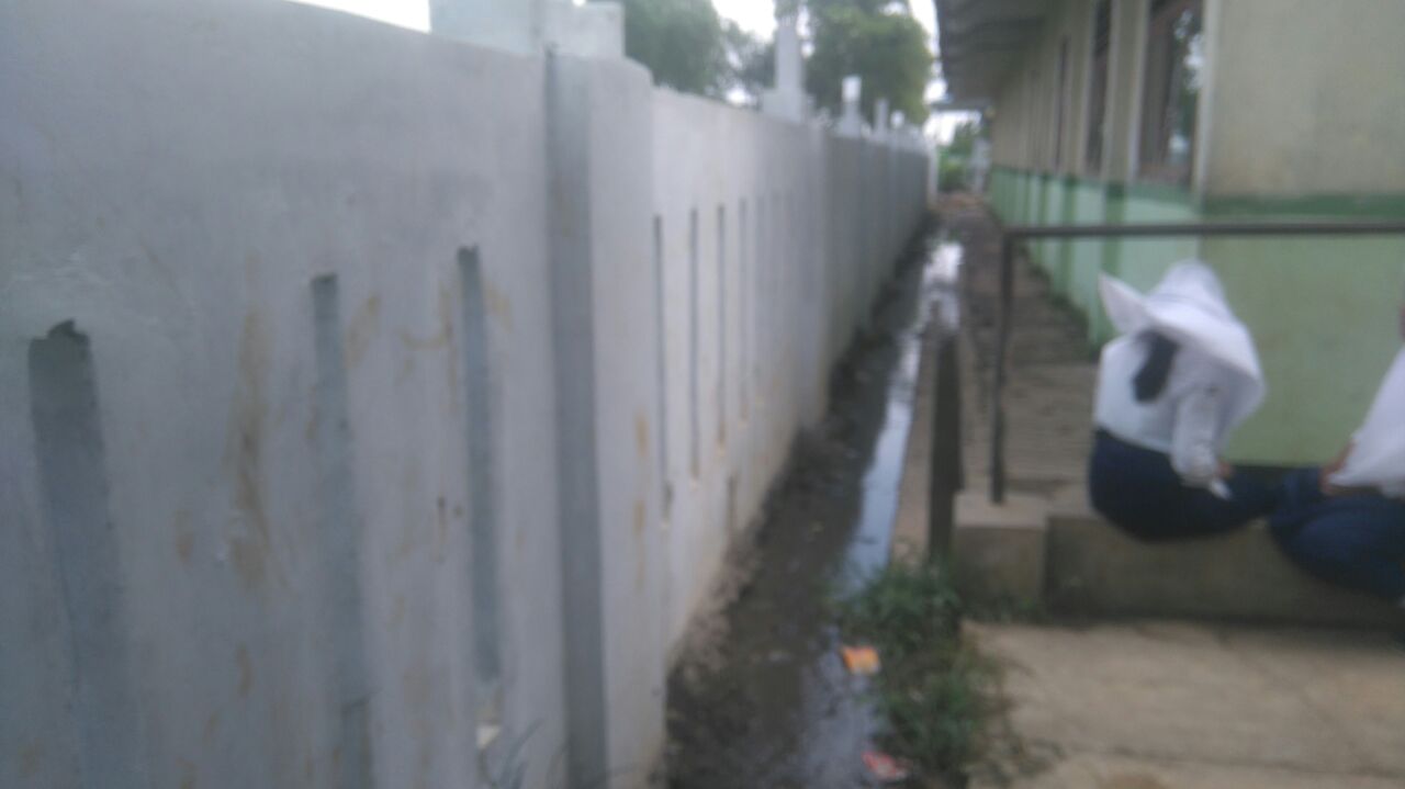 Air dari area persawahan yang terus masuk ke area sekolah tepatnya dibawah pagar yang dianggap belum selesai.